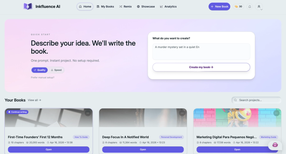 Instead of starting from scratch, you simply enter your idea and Inkfluence generates a structured outline, complete chapters, and a professional cover.