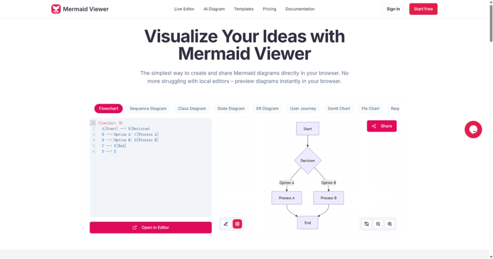 Online diagram editor with live preview, real-time collaboration, and AI-assisted coding for creating Mermaid diagrams directly in your browser.